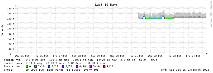 traceroute to 2001:470:1f13:814:1ad6:c7ff:fe2a:502 (2001:470:1f13:814:1ad6:c7ff:fe2a:502), 30 hops max, 80 byte packets - Generated at 2025-10-25 03:30:01